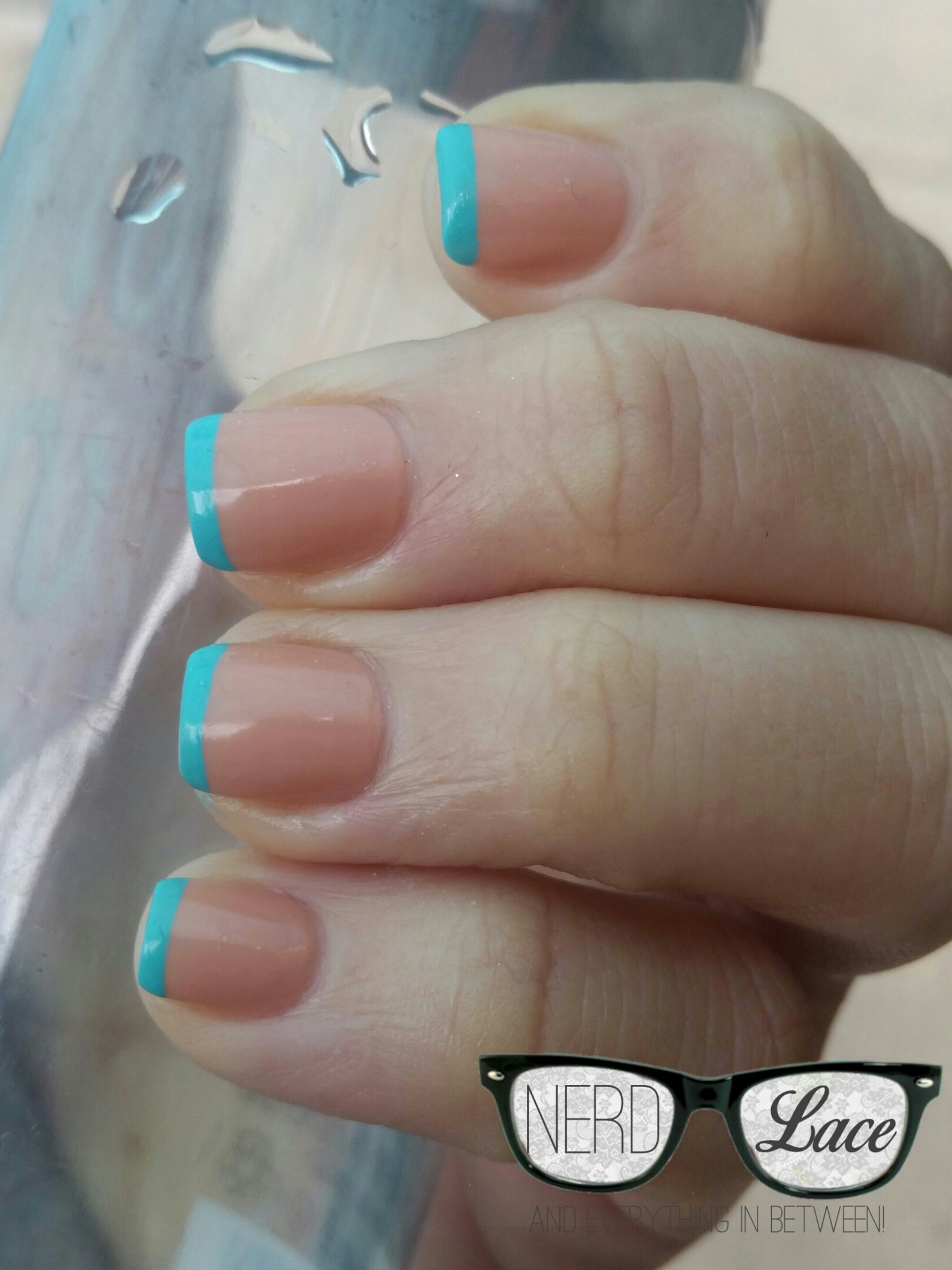 Sorry guys, I forgot to take pictures of the polish names. But you can accomplish this look with any nude base and turquoise or aquamarine for the French.