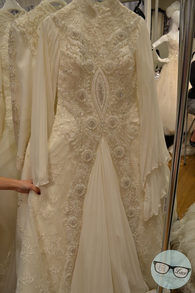 We both fell in love with this Tudor style gown. THE BEADING! It takes 30 people, 15 days to create this masterpiece. Please note that’s Jana Ann’s very hand holding the dress for us to see. She’s the sweetest!